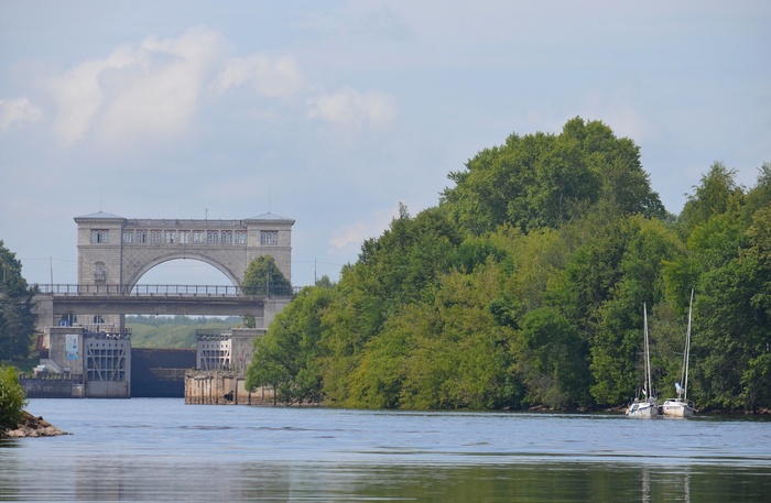Утро началась как обычно – солнце, завтрак и отсутствие ветра. Входим пораньше, впереди идет трехпалубник на шлюзовку, но попасть ним в шлюз не рассчитываем, все равно обгонит. Подходим ближе, связываемся со шлюзом, и приятным молодым женским голосом нам ответили, что придется немного обождать. болтаемся перед шлюзом, заранее связываем лодки лагом. Поочередно подходят толкач с баржей, Окский и ОС-ка.
