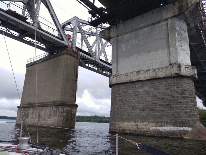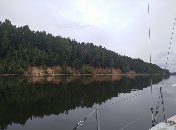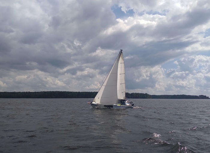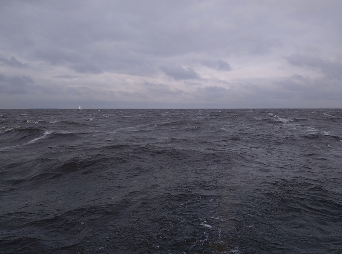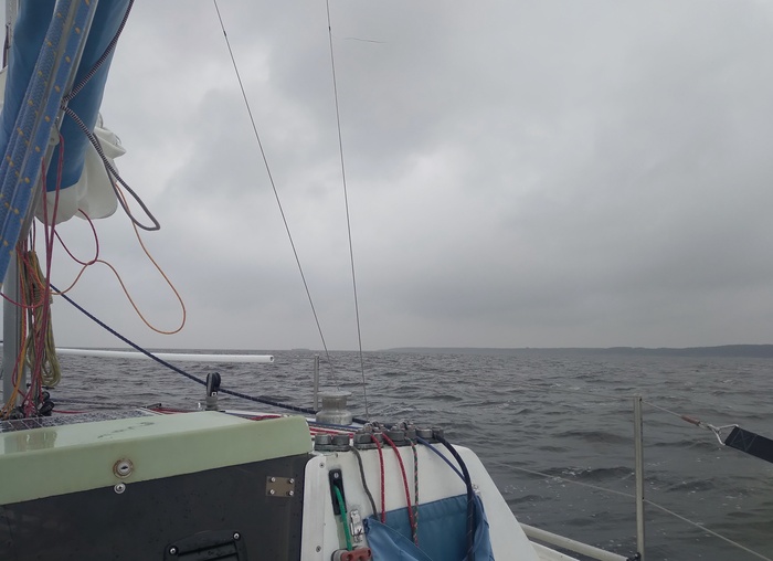 Наскоро выпив чаю, выходим. Я ставлю паруса, почти сразу приходится брать рифы. В этом году поставил закрутку грота, и взятие рифов, как и уборка парусов, никаких сложностей теперь не представляет. Все делается прямо из кокпита в одно лицо. Сергей сразу заводит мотор, я какое-то время иду под парусами.