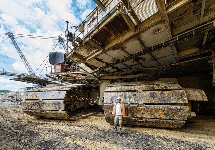 Но самое интересное здесь однозначно - циклопических размеров шагающий экскаватор, который снимает пустую породу ("вскрышу") и лентой транспортёра перекидывает её в отвал за линией добычи угля. Конструкция эта настолько огромна, что вблизи даже в широкоугольный объектив влезает только частично: