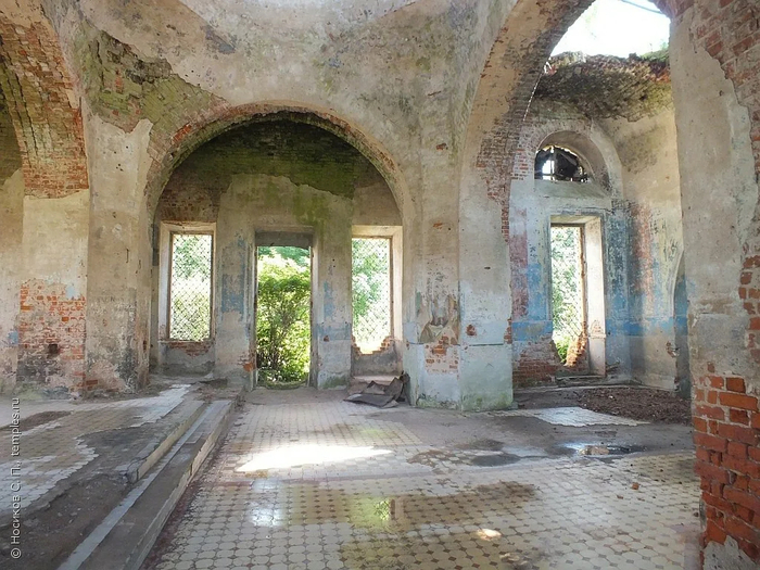 В настоящее время в храме ещё остались майоликовые полы и часть фресок, кто -то пытался вырвать стальные решётки на металлолом, но тщетно-строители XIXв надежно вмонтировали их в оконные проёмы. Ещё лет 10 назад мне удавалось подняться на верх колокольни, что было непросто, потому как лестницы давным-давно уничтожены