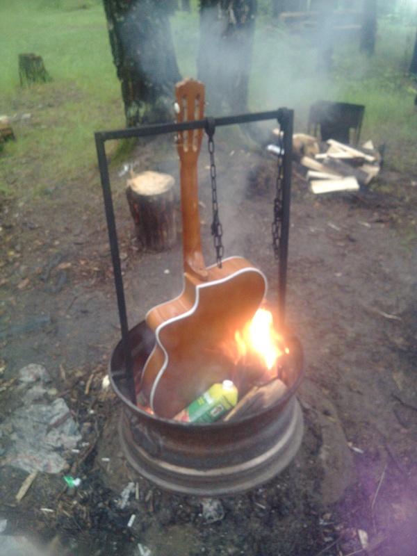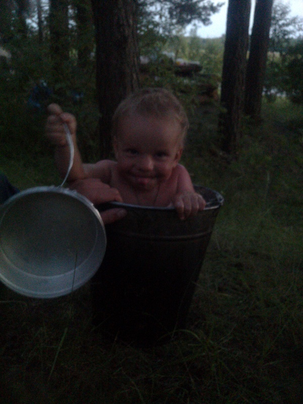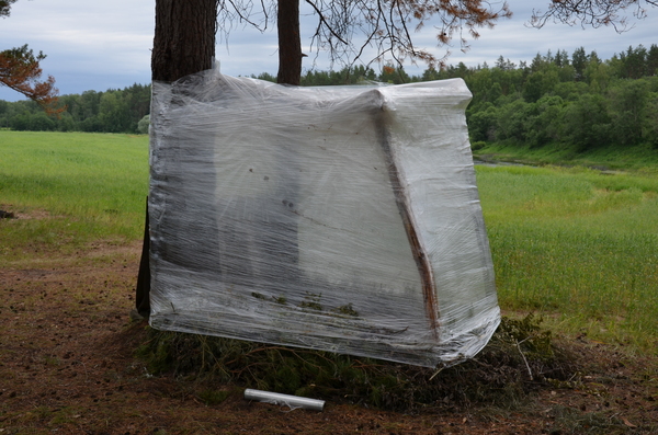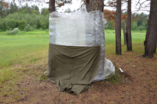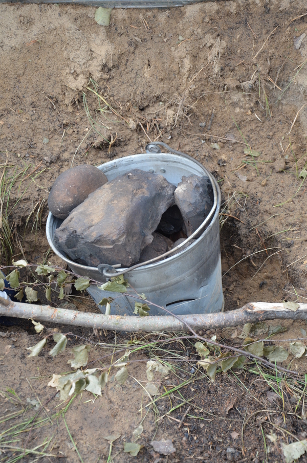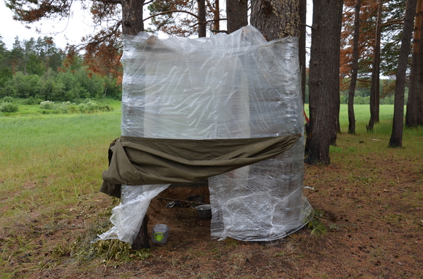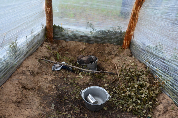По приезду я сказал что надо построить баню, на меня посмотрели очень странно и загадочна и подумали что я с ума сошел! Но я настоял на своём, мне выделили двух бойцов, топор и 4 часа свободного времени. Этап строительства к сожалению мы не засняли, но конечный продукт сняли. Выбрали два дерева, срубили две жерди вкопали в землю сделали поперечные балки, всё было обтянуто стрейч плёнкой ушло два рулона, по низу снаружи обложили ветками, в последствии пол внутри тоже устелили ветками ели. Камни собрали в Угре, ведром пришлось пожертвовать в него грузили камни и ставили в костёр час - полтора и камни готовы, заносили внутрь поддавали и парились.
