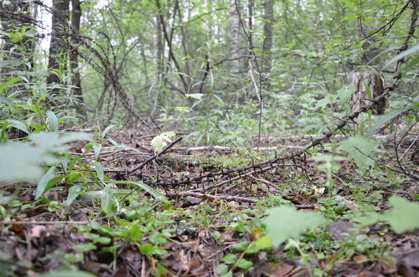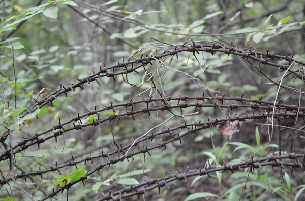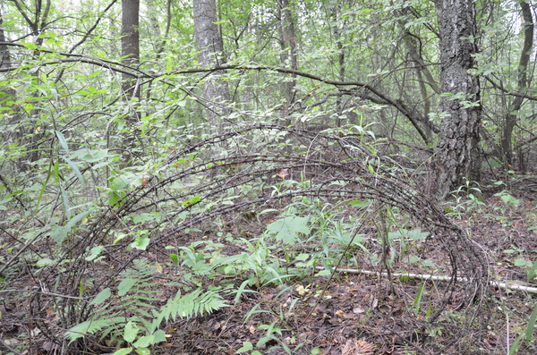 Колючка в лесу, такой ужасающей колючки я не видел никогда, весь лес был усеян ей. Страшно подумать, как бойцы с ружьём и в ватниках форсируя реку натыкались в ней на такую колючку да ещё под минометным обстрелом.