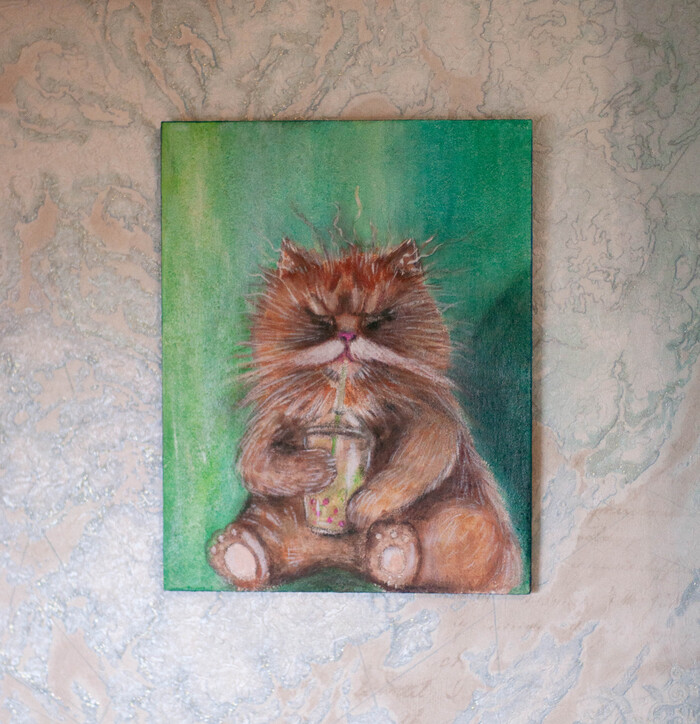▪️"Кот и недоброе чаепитие". Холст на картоне 15×20. Смешанная техника акрил и художественная пастель. Покрытие художественный лак.