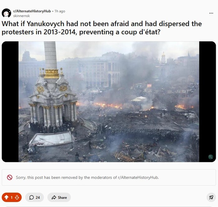 Всем привет. Иногда сижу на реддит, и там есть саббредит AlternateHistoryHub, где строятся любые, в том числе самые невероятные предположения о вариантах развития событий при изменении каких-либо условий. Там обсуждают и нацистов и коммунистов, и различные режимы, в общем всё подряд. Но почему-то мой безобидный пост был удалён. Есть предположения почему?