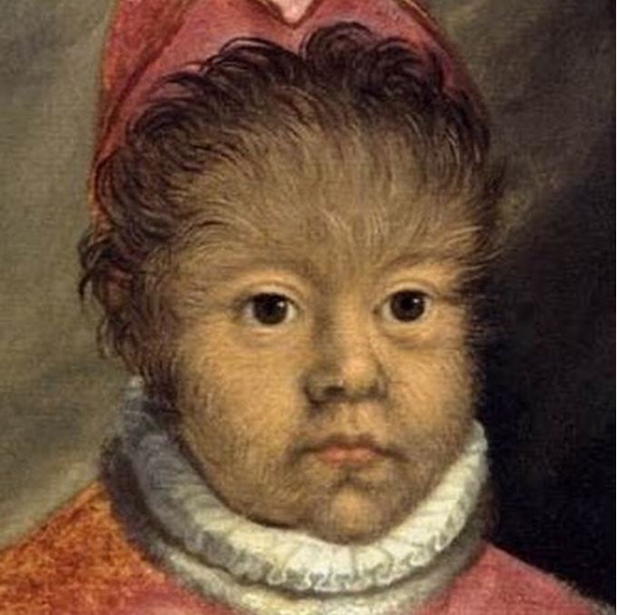 "Я увидел волосатую служанку, брови у неё были зачесаны вверх, а весь лоб такой густой и ровный, какой бывает на любой женской голове. Из каждого уха торчат по два длинных локона. У неё также была самая длинная борода и усы, а на самой середине носа росли длинные пряди волос, точно у собаки.Остальные части её тела не такие волосатые. Но по сравнению с обычными людьми волосы на них тоже очень длинные. Ими покрыты руки, шея, грудь и спина. Цвет светло-коричневый, тонкий, как выделанный лён... а в остальном она очень хорошо сложена, хорошо играет на клавесине".