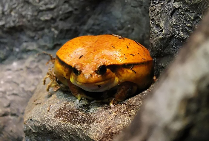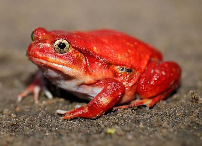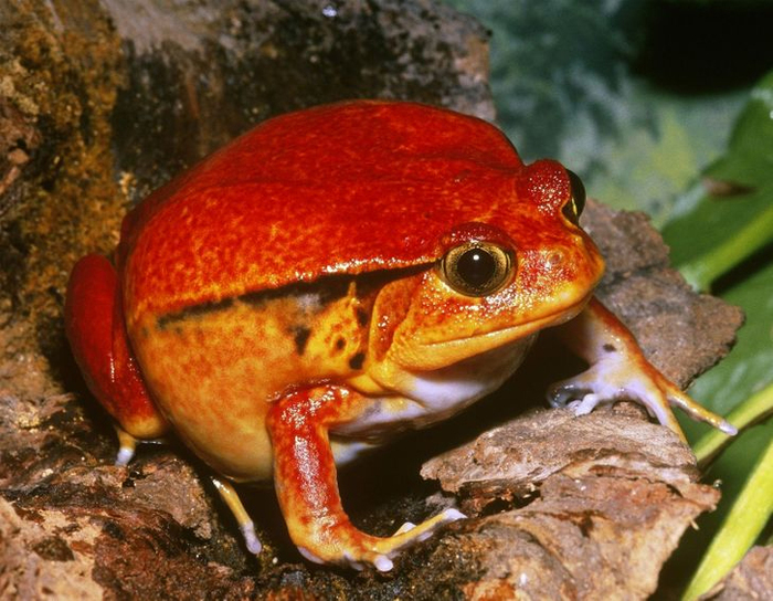 А название у неё ещё смешнее, хоть и очень логичное – лягушка-помидор, или томатный узкорот. Ну правильно, как её ещё назовёшь? Живёт эта немыслимая яркость исключительно на Мадагаскаре, зато там с ней можно встретиться практически где угодно: от густых дождевых лесов и болот, до сельскохозяйственных угодий и городских парков.