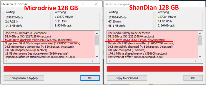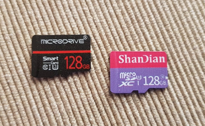 А вот главная же проблема всплыла совсем недавно – на AliExpress началась повальная эпидемия. Все купленные карты китайских брендов емкостью от 128 ГБ и более оказывались фейковыми. Первым звоночком был вот этот тест 10 карт, где 9 из 10 провалили тест на объем, оказавшись поддельными или дефектными. На этом фоне я заказал пару самых популярных 128-гиговых моделей по числу покупок, Microdata и ShanDian. Обе – фейки.