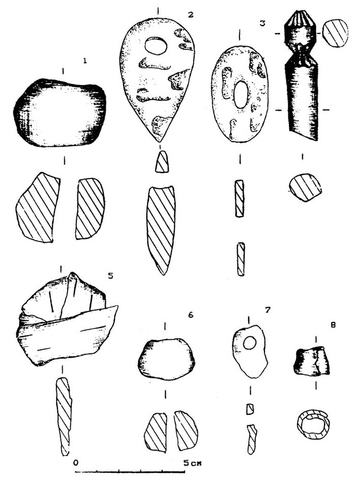 Известняковых грузил такого размера, чтобы они подходили к крючным снастям, буквально единицы, по форме они удлиненные с отверстием в верхней части. Самые маленькие керамические грузила представляют собой либо шар, либо просто несформованный кусочек глины (рис. 11, 6).