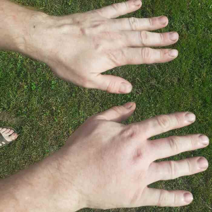 В доме уже спокойно переоделся и каким то интуитивным чутьем понял, что столько пиздюлин в одно место - это замного, наверное и догадался кое как снять обручальное кольцо. Это было офигенно правильной идее, по тому что лапка начала опухать. На этой фотке не особо видно.