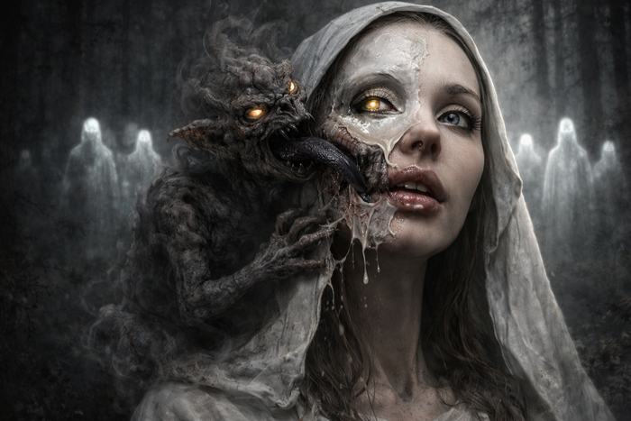 Бледная и изможденная, с губами, слишком широко растянутыми по черепу.