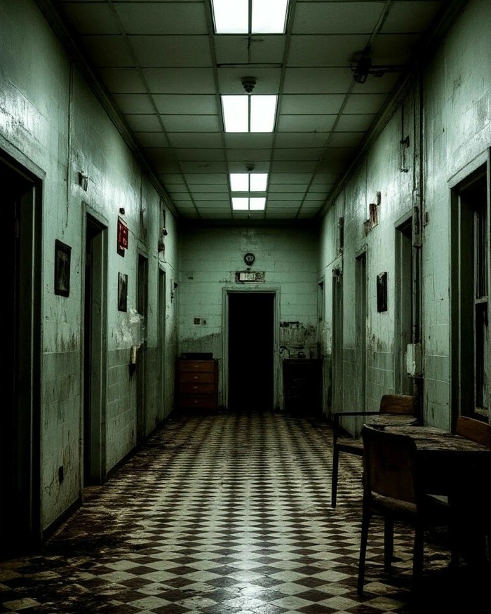 Двери палат одновременно открылись и захлопнулись, затем снова распахнулись, одна за другой. Казалось, отовсюду веяло пустотой: за каждой из них — никакого движения, только тёмные силуэты. Из дверей не выходил никто, но сам факт открывания добавлял абсурда — как будто коридор притворялся живым.