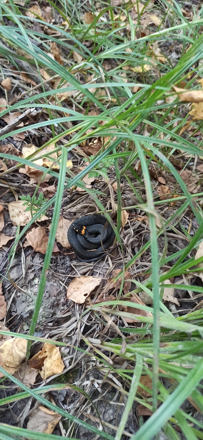 Ужик долго не хотел залезать ко мне на ладонь, а потом пытался удрать, но у меня была ловкость рук и никакого мошенничества. Едва донёс его до газона, и там он стремительно скрылся под листочком.