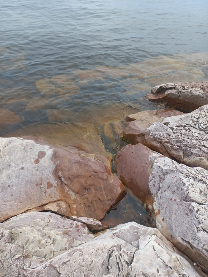 Песчаные пляжи перемежаются выходами черных габбро-диабазов и розовых шокшинских кварцитов.