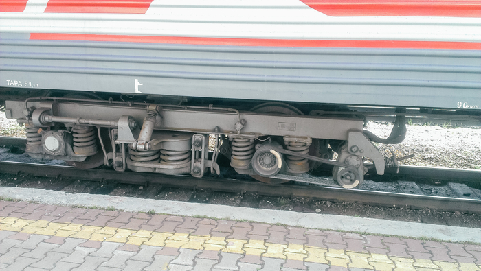 Строительство железных дорог на острове Сахалин началось японцами после русско-японской войны 1904-1905 года, когда в результате заключения Портсмутского договора южная часть Сахалина, до 50-й параллели, отошла к Японии. При этом основное строительство шло с использованием колеи 1067мм, принятой в то время в Японии как основной. Вот так выглядели колеса нашего вагона, как видите, они утоплены вовнутрь.