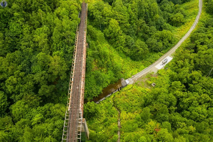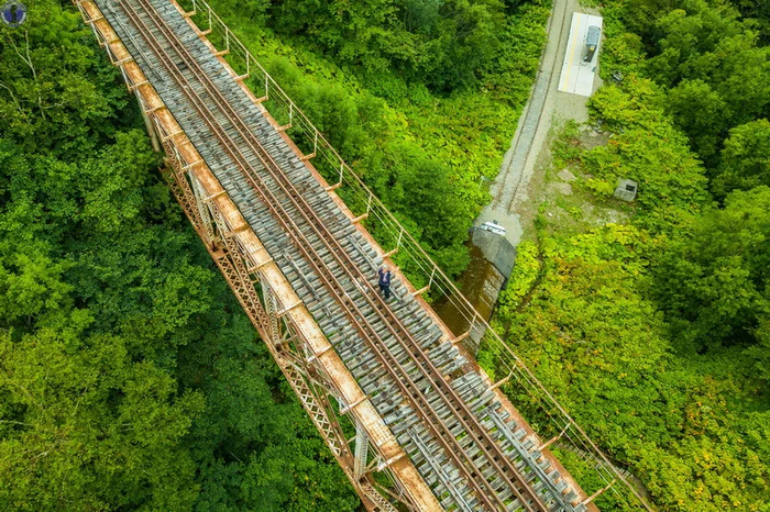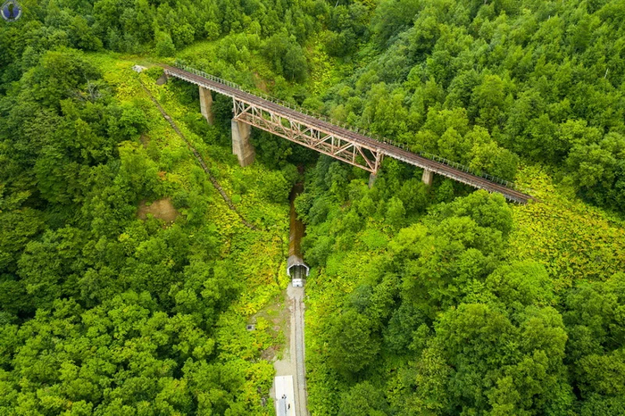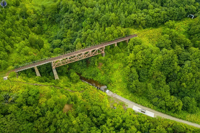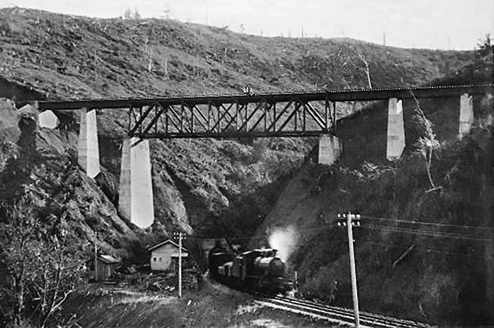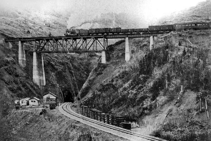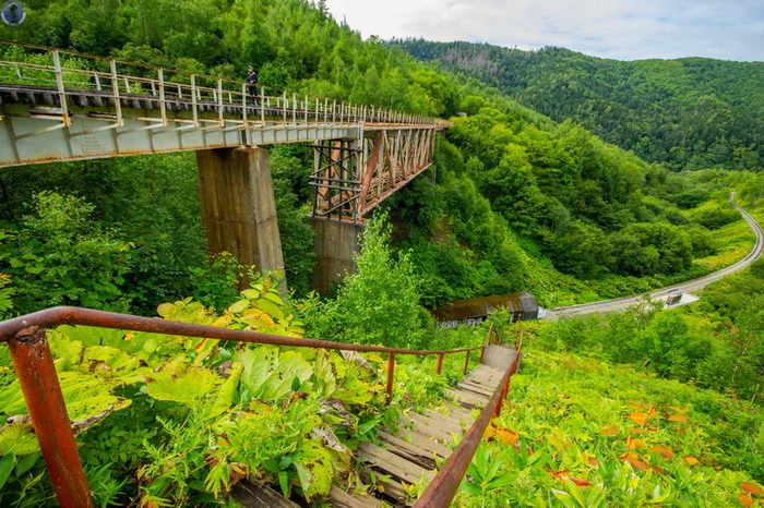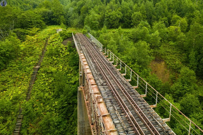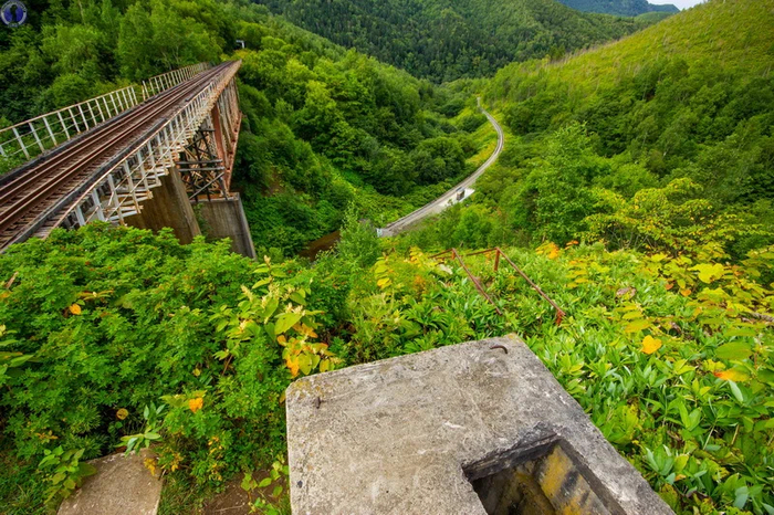 Как мы уже писали в статье про спираль "Такарадай", где расположен знаменитый "Чёртов мост", после поражения в Русско-японской войне 1904-1905 гг., южная часть Сахалина отошла во владение Японии, которая организовала на ней губернаторство Карафуто и принялась активно добывать полезные ископаемые и биоресурсы, строя фабрики, шахты, рыбацкие поселения и т.д. А для транспортировки грузов к пирсам и последующему их вывозу в Японию в 1921 г. началось создание мощной железнодорожной сети в сложной гористой местности с проходкой тоннелей в сопках и постройкой мостов в распадках между ними.