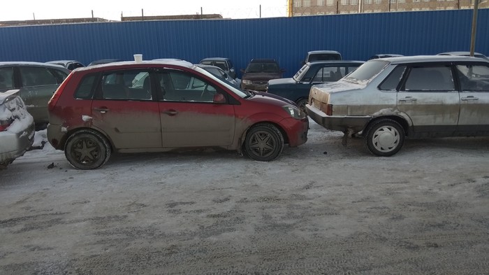 Сегодня вообще вот так припарковался. Пришлось пять раз вылезти из машины! ( Расстояние примерно 4-5 см. Между мной и ими )