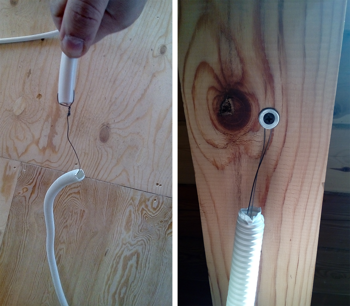 Протяжкой гофры протыкаю кабель, делаю петлю. Другой конец креплю саморезом с шайбой к стене. Один легко протянул отрезки 15 метров ПВС 5x2.5 и 10м ВВНнг 3х2,5 без проблем.