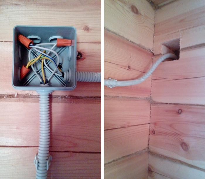 В розетках под гофру отверстие сверлю перовым сверлом на 15мм, немного ножом подрезаю, получается аккуратно.