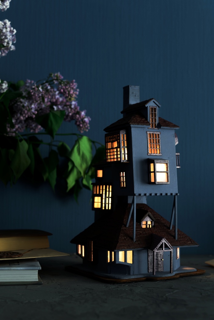 Компоненты те-же, что и у Лавки Олливандера, но здесь обычная светодиодная лампочка просто не помещается. Решил использовать светодиодную гирлянду на батарейках, зато все этажи оказались равномерно освещены.