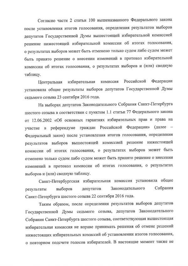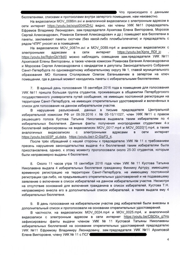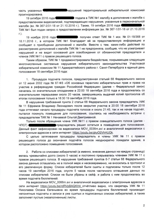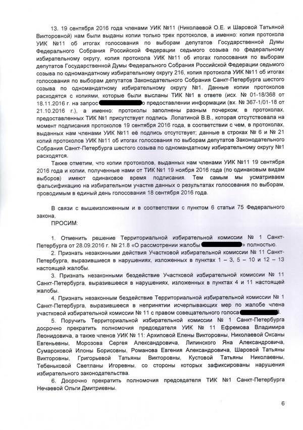 Ближе к 6 утра уже 20 сентября председатель, в нарушении закона, так и не дав ознакомиться с ними “независимым” членам комиссии, спрятал книги избирателей в сейф и начал заполнять увеличенные формы протоколов, висящие на стенах. В них он вносил данные, которые должны были быть получены в результате работы с книгами избирателей, а по факту он тупо списывал данные с кем-то заботливо напечатанной бумажки. К сожалению, законных прав прервать всю эту дичь у “независимых” членов комиссии не было. И единственное, что им оставалась - фиксировать все это и подавать жалобы. Много жалоб. От ТИК №1 до СПбИК и ЦИК.