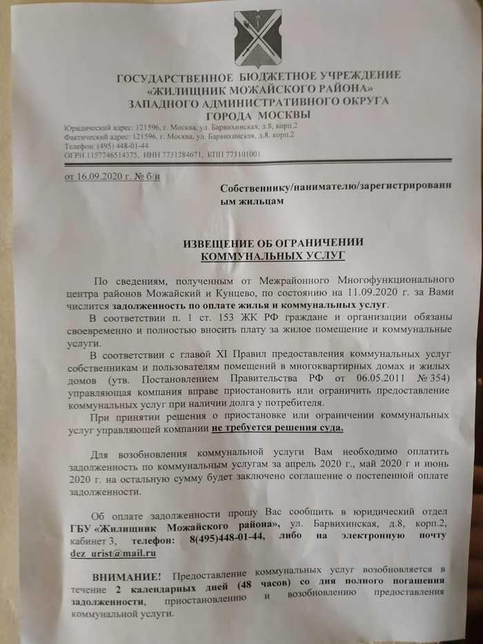 Управляющая компания отключила электроэнергию незаконно. Мы проживаем в коммунальной квартире, три семьи между собой не связанных родственными связями. Счет на оплату за электроэнергию приходит только на нашу семью, то есть мы платим за общий счётчик - за всех. Счет по коммунальным услугам разделён естественно. Так вот, мы исправно платим за все услуги - электричество, коммунальные услуги и газ. Конкретно наша семья. Нашему соседу по квартире приходили неоднократно претензии. Претензии эти поступали в почтовый ящик, лично сосед их не получал. Также, никаких заказных писем об информировании о предстоящем отключении не было. Я лично проверяю почтовый ящик. А то, что заказного письма так и не было, является действием незаконным. В претензиях было написано о том, что в случае неуплаты и, игнорирования данной претензии, кредитор будет вынужден обратиться в суд для взыскания задолженности в судебном порядке. Никакого предупреждения о том, что в случае неуплаты будет отключено электричество не было. Почему сотрудники ГБУ "Жилищник Можайского района" ведут незаконные действия? Ведь согласно 442 постановлению, если задолженности за электроэнергию нет, то и свет отключать не имеют права! Мало того, не затрагивая другие постановления, речь идёт о том, что в коммунальной квартире проживают маленькие дети! В результате этого отключения у меня произошла поломка стиральной машинки, т.к. в этот момент она стирала. Это первое. Второе, в тех многочисленных претензиях, что вывешивались также рядом с нашей дверью, был указан номер телефона, по которому можно позвонить и, пообщаться более подробно об образовавшейся задолженности, а также выяснить причину отключения электроэнергии. Два дня никто не берёт телефон! Мне пришлось брать с собой двух маленьких детей, бросая все свои дела, и ехать решать эту проблему. Продукты, включая мясо в морозильной камере предназначенное для детей, находились какое-то время в выключенном холодильнике. Это отдельная история. В УК меня заверили в том, что электричество включат, но его так и не включили, муж подключал самостоятельно, иначе дети остались бы без еды. На следующий день опять пришёл мужчина и, отключил электроэнергию, сказав, что поступило распоряжение об этом. А о включении такового распоряжения не было. Хотя, накануне, повторюсь, в УК начальник юридического отдела пообещал, что свет включат в тот же день. Почему, указывая номер телефона для связи, звоня в рабочее время, то есть я звонила в районе 15:00-16:00, согласно графику работы УК, сотрудники должны были находиться ещё на месте. Звонила на протяжении часа, после чего пришлось опять бросить все свои дела, брать детей, и ехать вновь разбираться. Никто не принёс своих извинений. Несмотря на то, что действия УК являлись незаконными и противоправными. Мы ещё не решили однозначно, но, думали о том, чтобы подавать в суд на Управляющую Компанию, ведь в данной ситуации, правда, на нашей стороне. Была сегодня в Жилищной инспекции - там скажи, что по постановлению Мишустина наказать УК нельзя, только подать на них в суд. Что за самоуправство, беззаконие без наказания? Намерена идти дальше! Кто-то может тоже хочет подать иск, хочу попробовать коллективный иск против нашей УК. Если кто-то что-то знает, пишите, пожалуйста! Такой беспредел не только в УК. Позже напишу пост про секр
