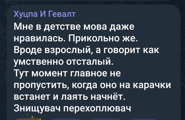 С детства не нравился этот говор, много родни с Украины, да около. Просто не нравилась на звучание, потом началось... С начала 90х слышал как меня и мою родню ненавидят, но очень ждут подарков на НГ, ДР и т.д. Про то, кто такие москали и кацапы, я знал с 5 лет. Но не мог понять почему их "на ножи", ну что может ребёнок 5 лет понимать почему так? Максим шахматы я понимал ещё, а тут- дядьки, тётки, братья, сёстры- внезапно все плохие(не все "в семье не без урода") Но мову не люблю не из-за нынешней политики, просто неприятна с малого детства. Надеюсь, адекватная родня с Украины в порядке. Один из братьев уехал в Израиль, ещё в 14 году, хз что с ним нынче, второй около Ялты проживал, нет связи, ребята адекватные, надеюсь живы и здоровы.