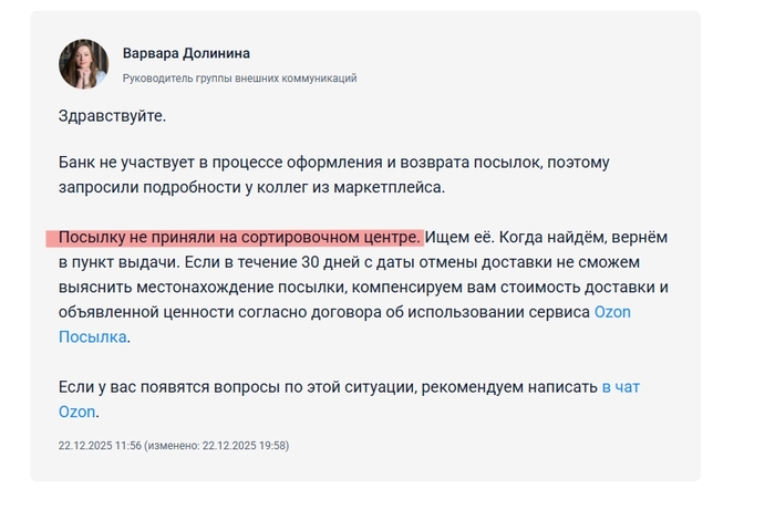 Для ЛЛ: Озон потеряла посылку с памятными вещами.