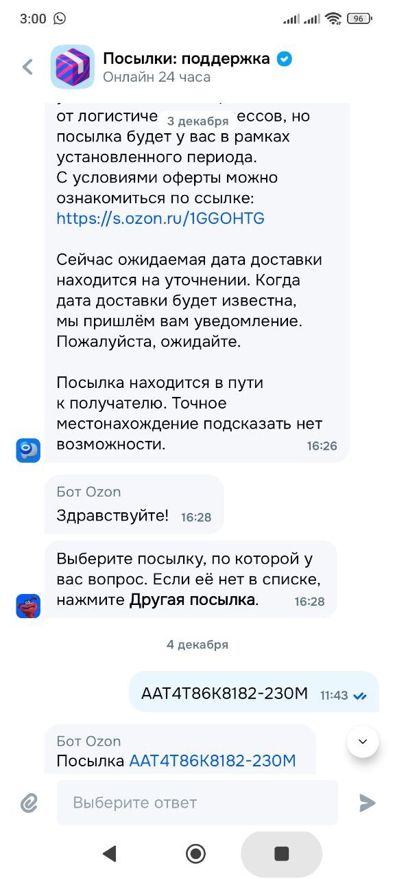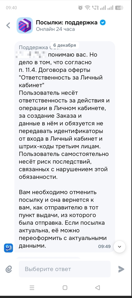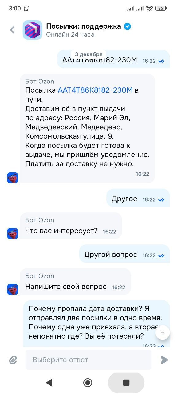 Начинаю писать в поддержку, там отвечают, что номер должен быть введен в приложении, иначе доставка просто не привяжется. Оказывается, что у мамы на момент отправки был введен другой номер телефона. И по сути посылка уехала в пустоту (хотя оба аккаунта активные и есть выполненные заказы). И никакого резервного способа получения посылки нет.