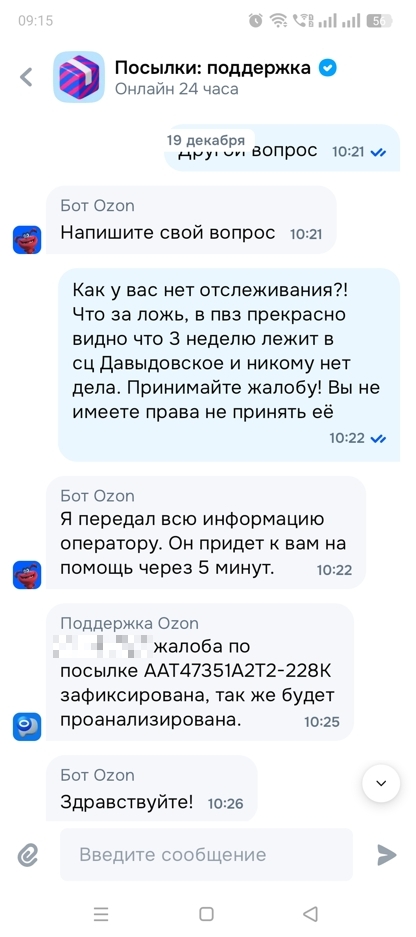 @Ozon, Посылка AAT4T86K8182-230M Предыдущие обращения: Озон ворует посылки, Озон ворует посылки Ч. 2 Первое: Какие меры приняты для нахождения посылки? Второе: Какое обоснование дадите того, что я отправлял две посылки одновременно и та, в которой находилось барахло дошла до меня в сроки, а вторая, в которой находилась дорогостоящая техника, ой, неожиданно пропала? Третье: Как вы прокомментируете то что ваша служба поддержки на протяжении двух недель меня вводила в заблуждение касательно местонахождения моей посылки? Что это если не хищение чужого имущества путем злоупотребления доверием? Что есть статья 159 УК РФ.