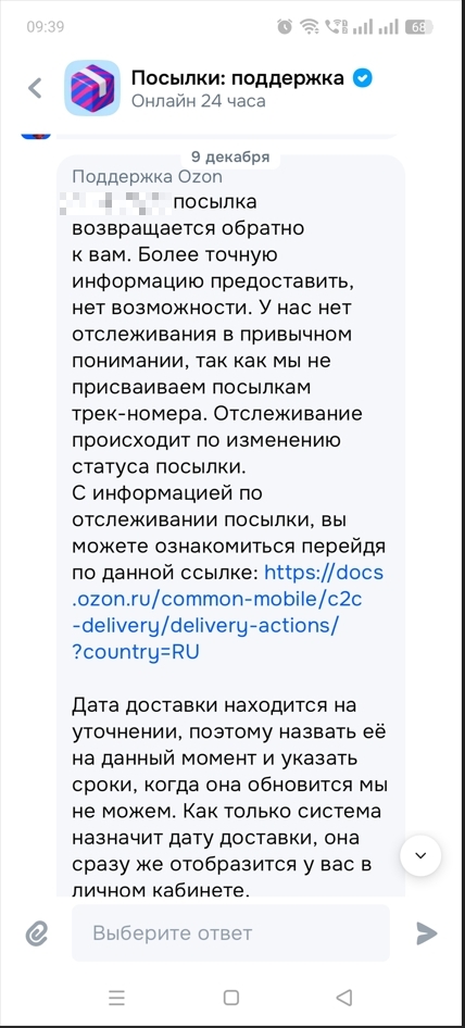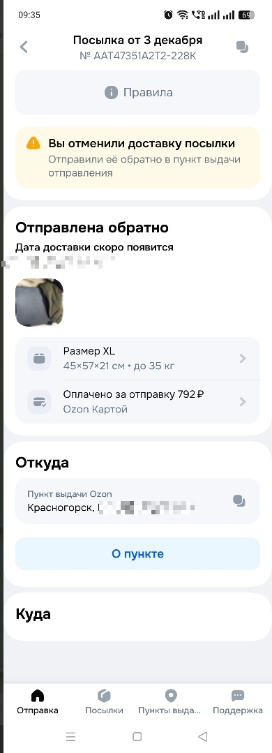 С 8 декабря посылка висит в статусе "Отправлена обратно" и "Дата доставки скоро появится".