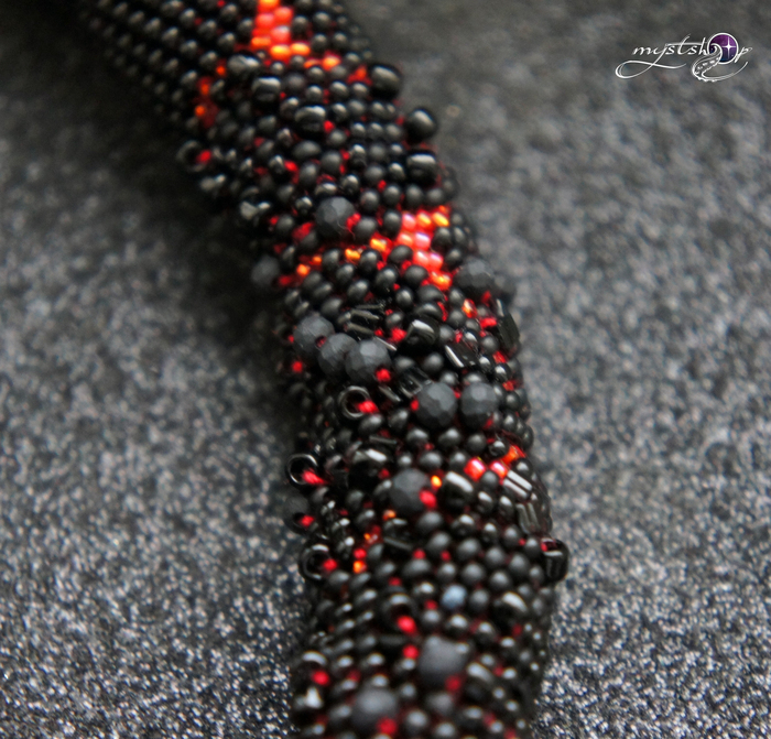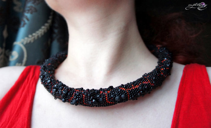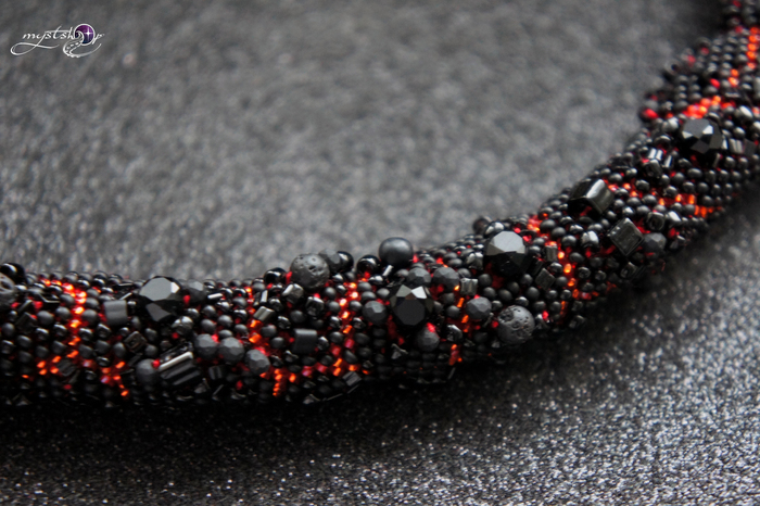 Длина жгута 45 см плюс 5 см удлинительная цепочка. Ширина 2 см, внутри жгута легкий каркас, благодаря чему украшение не заламывается. Японский и чешский бисер разных форм и размеров, бусины настоящей вулканической лавы, чешские граненые бусины.