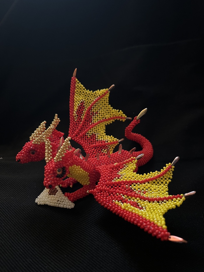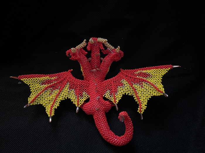 Материалы: фигурка сделана из чешского бисера, стеклянные глазки, на гребне и крыльях - шипы бусины, внутри наполнитель. В крыльях и в хвосте вставлена проволока для подвижности.