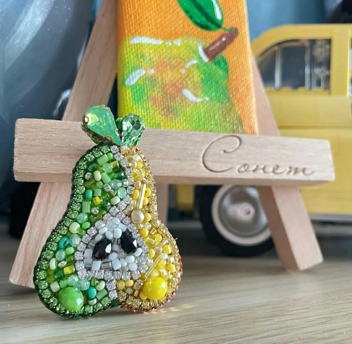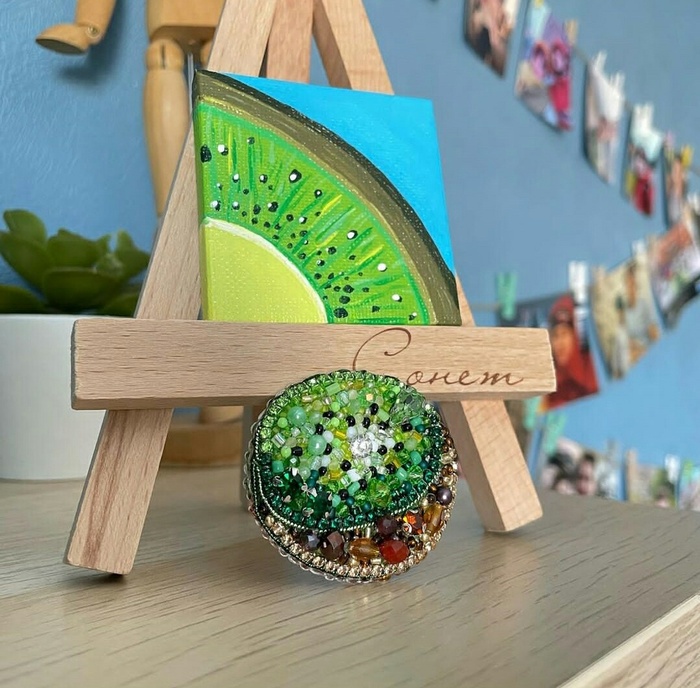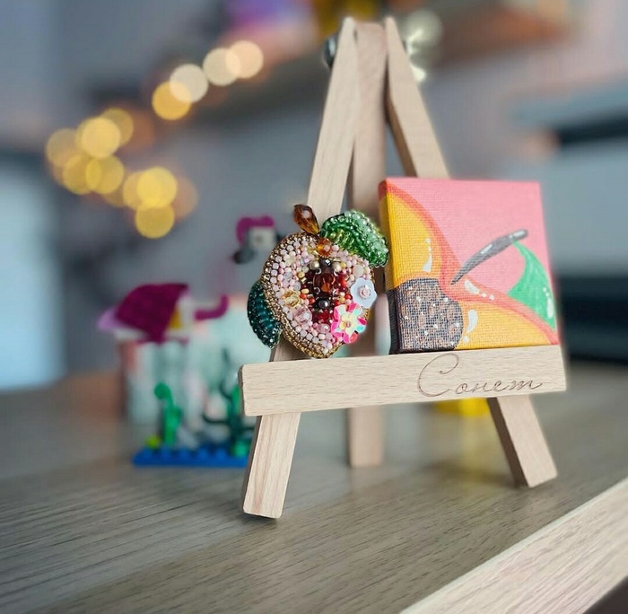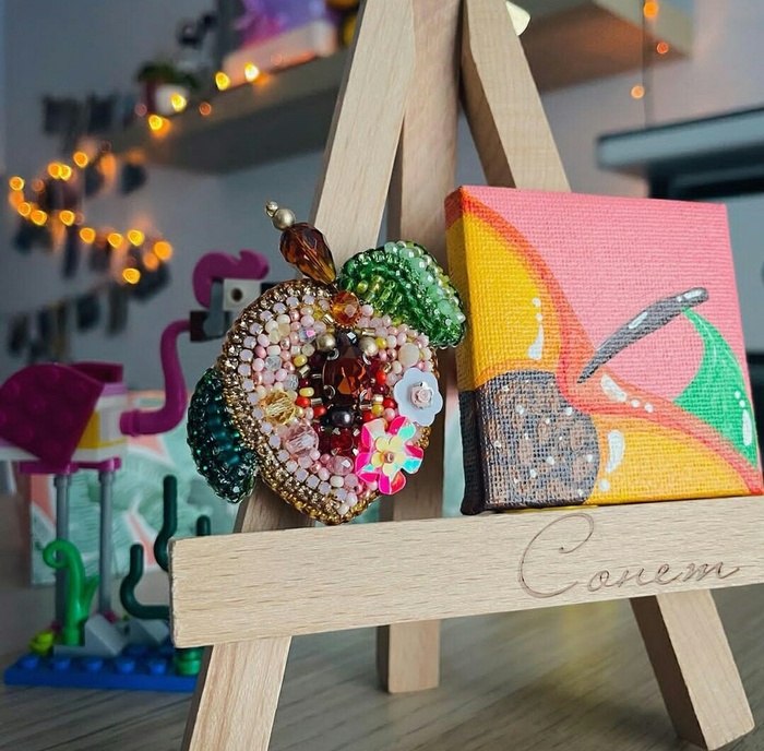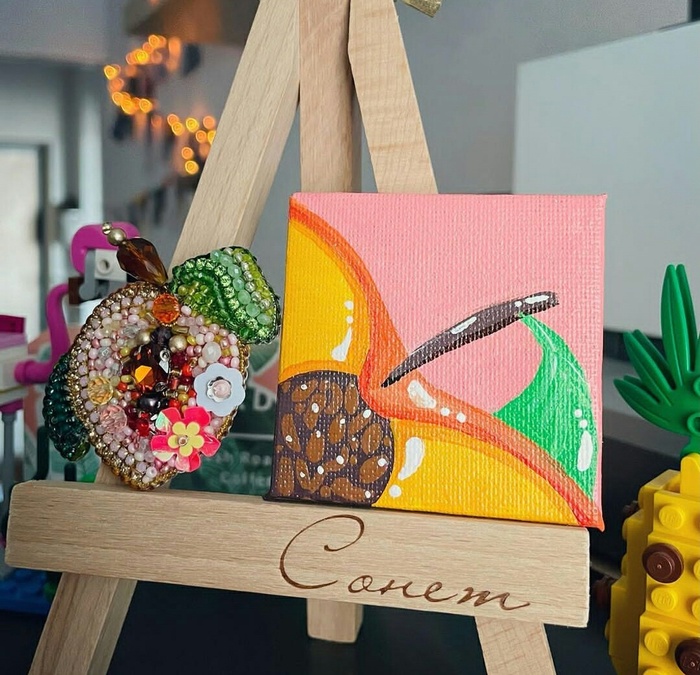 А поскольку я с детства дружу с бисером и мелкой моторикой- решено, брошкам с фруктами/овощами быть! Плюс, к каждой броши я рисовала миниатюру акрилом на холсте :) Всего у меня получилось 14 комплектов (брошь и холст).