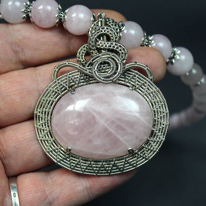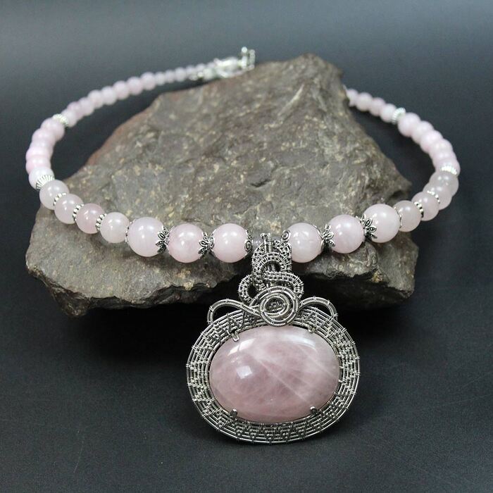 Авторское колье с кулоном из проволоки и натуральным розовым кварцем