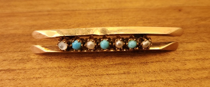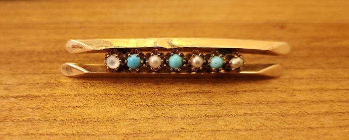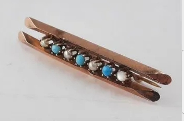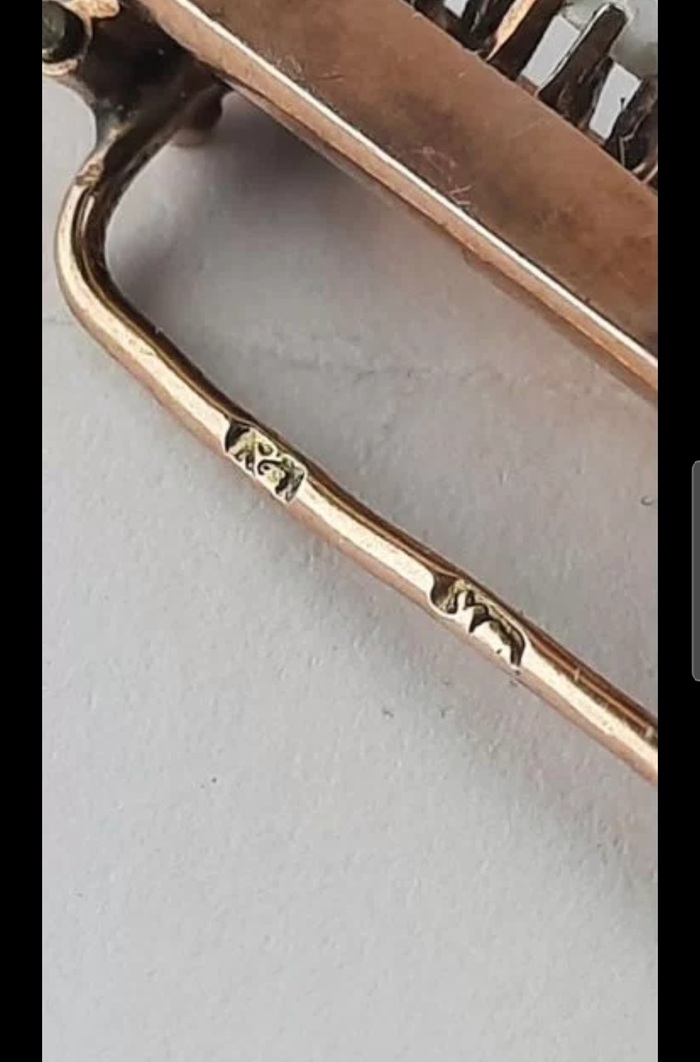 Надеюсь, знающие люди помогут опознать, где произведена брошь. Брошь золотая, есть проба 56, но просто цифры, без головы в кокошнике. На игле вроде бы есть что-то напоминающее инициалы мастера, и вместо клейма нечто, похожее на арабскую вязь. Пологаю, что брошь импортная или сделана где-то на Кавказе, а цифра 56 нанесли позже. Тёмные пятна на золоте - просто блики. Вставки - бирюза и, вероятно, мелкий жемчуг. И она слегка помята