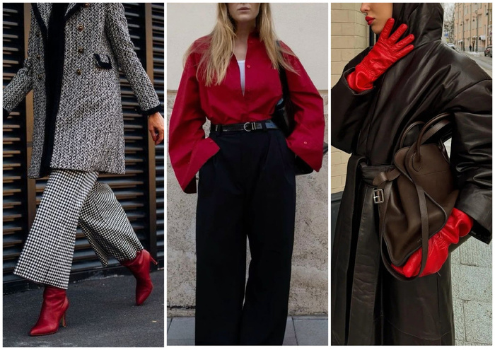 Небольшие детали, которые позволяют "примерить" тренд. Красный ремень может оживить базовое платье, а перчатки сделать акцент в верхней одежде.