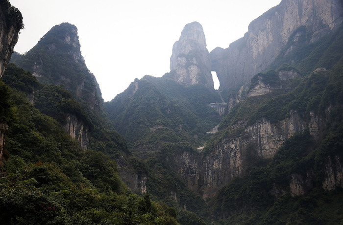 Гора Тяньмэнь. На гору можно подняться по канатной дороге, построенной Французской компанией Poma; сесть на неё можно около ближайшей железнодорожной станции Чжанцзяцзе. Канатная дорога Тяньмэнь часто упоминается в туристических гидах как «самая длинная высокогорная канатная дорога в мире». Она состоит из 98 вагонов, её общая длина 7455 м перепад высот составляет 1279 метров, а самый крутой угол подъёма 37°