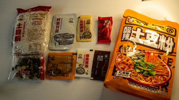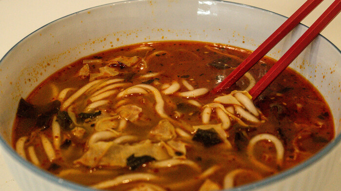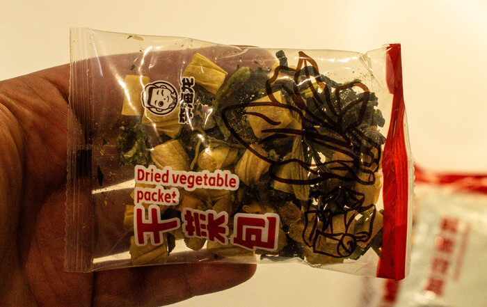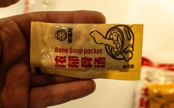 По вкусу это прям китай - китай, пробовал много разных малатанов, этот можно описать как лайтовый вариант для пробы. Не слишком острый, в меру кислый, но очень пряный из за огромного количества пакетиков и присыпок. Порция выходит большая, нам на двоих хватило вполне. Так же много овощей, овощи тут в основном выступают в качестве наполнителя, так как основной вкус дает суповая основа, пряное масло, перечное масло и костный бульон.