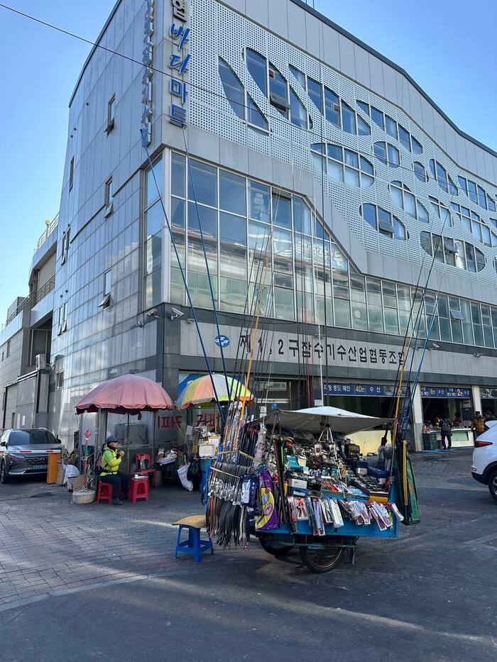 2, 3) Сам рынок это большое здание. Но вокруг него рынок обычный, где так же продают моллюсков, рыбу, водоросли, удочки и всё рыбное.