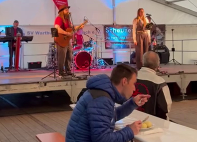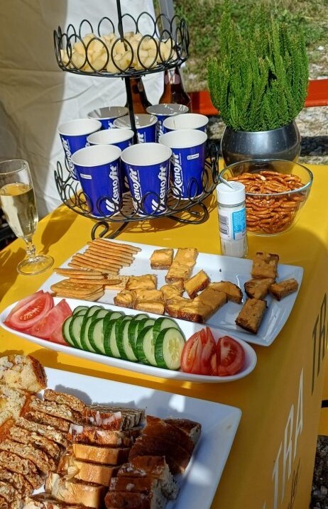 Еще можно наслаждаться едой на ПП. На последней ПП из 2го круга царит баварская атмосфера, играет живая музыка и меня уламывают на пиво. “Оно тебе поможет!” - уверенно утверждает волонтерша. Ну, если вы настаиваете, я беру стаканчик баварского, отпиваю маленький глоточек - беее! На солнце пиво достигло температуры чая, я отплевываюсь, запиваю колой, она тоже теплая, но чуть менее противная. Гели, кстати, заходят уже тоже с большим трудом из-за жары.