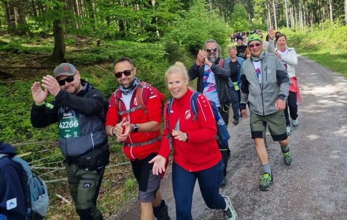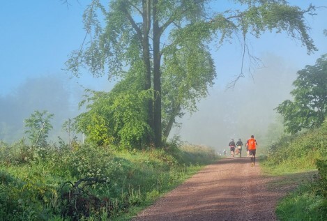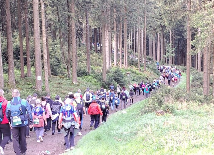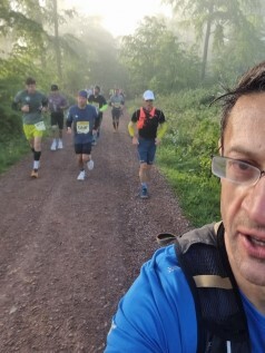 Подъем крутой, покрытый валунами, уклон 10-30%, Альпы - не Альпы, но очень похожи. Не Таунус. Без палок была бы беда. Чисто психологически, подъем длится очень долго, видимо потому что незнакомый и еще потому что пережал с темпом в начале. Наконец достигаем вершины, отсюда - спуск, потом опять подъем, и - первый ПП, пункт питания. Волонтерша громко поет “Гутен морген, гутен морген”, а в динамиках у нее играет этот популярный в русскоязычной среде голландский вариант (“хуемое, хуета”). Это поднимает настроение. К тому же уже начинает светать.