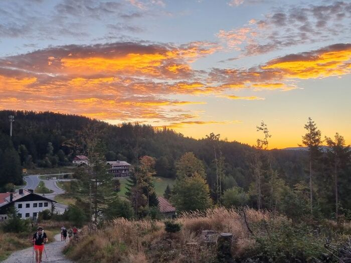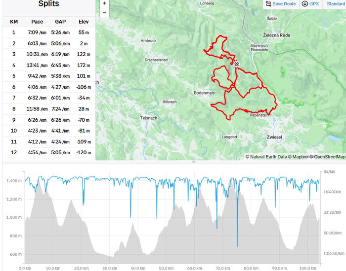 Баварский Лес, где проходит ультрамарафон - это не Альпы. Самая высокая гора, этот самый Арбер - 1400 м. Я предположил, что это должно быть похоже на мой домашний Таунус, ну ок, чуть покруче, но далеко от настоящего высокогорья, как было в Австрии. Даже сомневался, брать ли палки. Общий набор орги обещали 3,700 м на 100 км, причем я сильно подозревал, что врут, преувеличивают, цену себе набивают, как часто бывает.