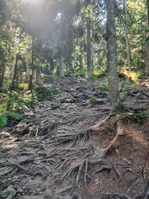 Это одиночество, журчащая речушка под рассветным солнышком вводит в некий дзен. Течет ручей, журчит ручей - и я ничей, итд… Хорошо, только прохладно, тут гораздо холоднее, чем наверху. И особо не разгонишься, тропинка неровная и коряжистая, навернешься - обломает дзен нафиг. Под конец надоедает, радуешься когда дорога заворачивает опять в гору.