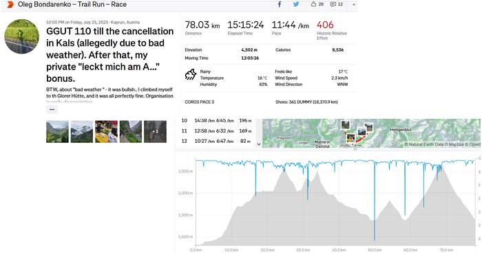 Нет сомнения, что этой гонки бы не было (с моим участием) если бы GGUT прошел, как планировалось. Но, как я уже писал, забег в Австрии был безжалостно кастрирован, и даже с бонусными километрами, которые я сделал в частном порядке после официальной остановки гонки, вышло лишь 78 км/4500м набора и осадочек остался неприятный.