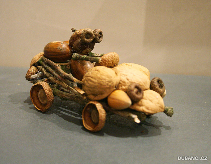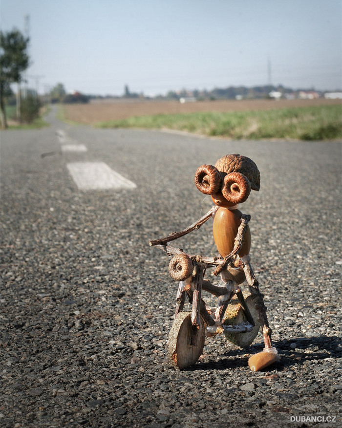 Насобирав кучу желудей - благо, с деревьев их сыпалось немало, я создал - в конечном итоге - всего 3 фигурки. Но зато в этот раз каждой из фигурок я уделил много времени и проработал детали. Один из них получил велосипед, а второй так и вообще машину. Все они довольно долго простояли на подоконнике, пока не были выброшены во время уборки.