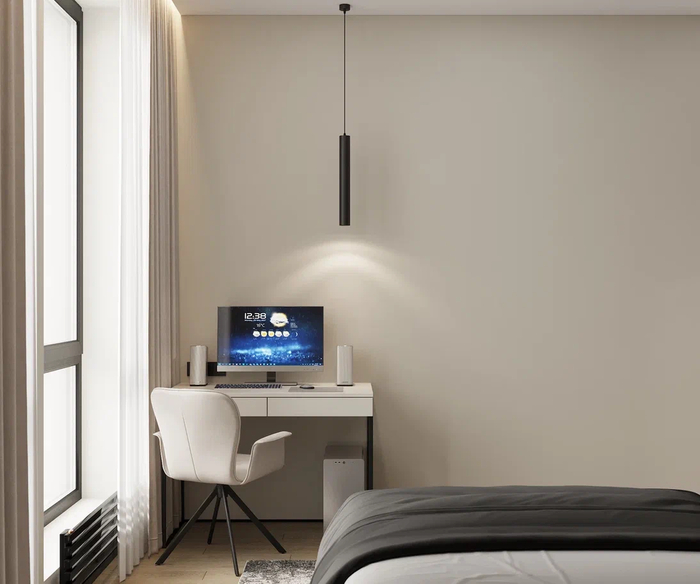 Кабинет оформлен в нейтральной палитре с акцентом на тёплое освещение и текстуру дерева. Рабочая зона выделена тёмной стеной и подсветкой, создающей выразительный ритм. Стол из массива и эргономичное кресло подходят и для работы, и для отдыха.