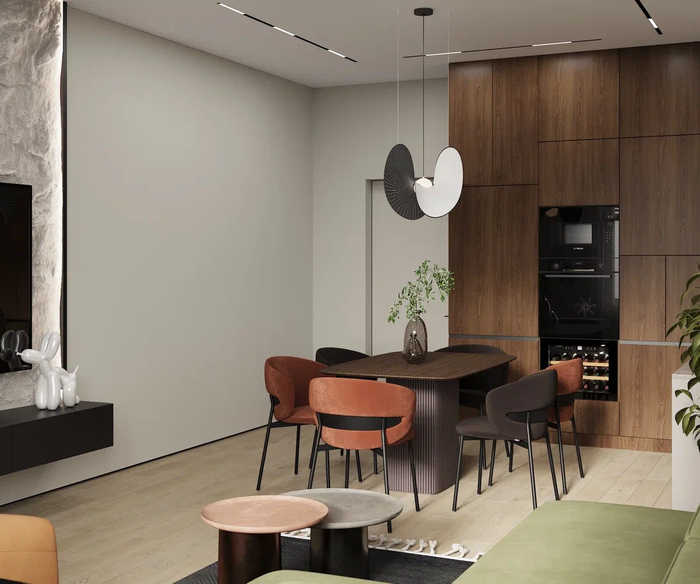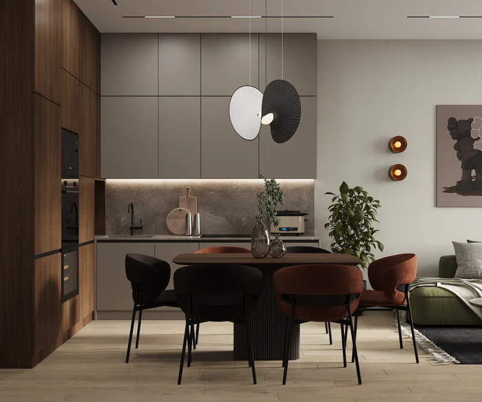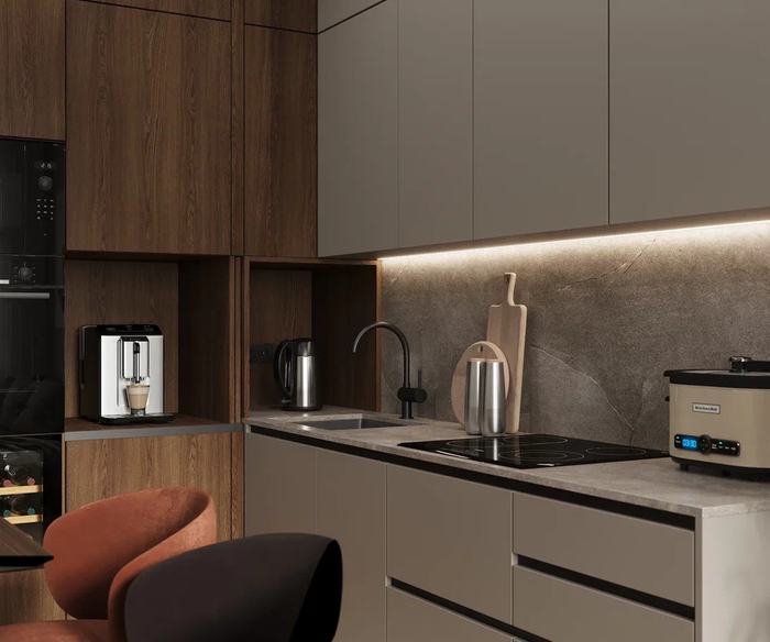 Кухня выполнена в спокойных оттенках серого и дерева. Вся техника встроена в единый пенал, где также разместили винный шкаф — одно из пожеланий заказчика. Рабочая зона дополнена подсветкой и скрытым отсеком для кофемашины, что делает кухню аккуратной и визуально чистой.