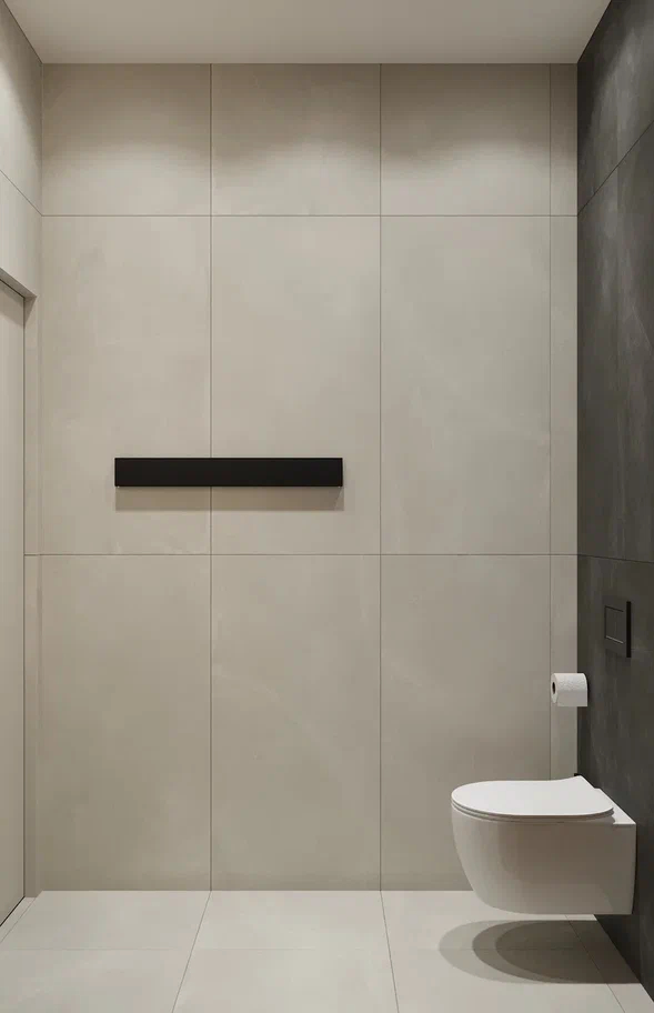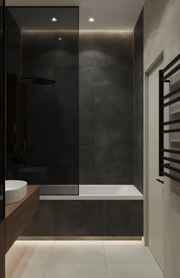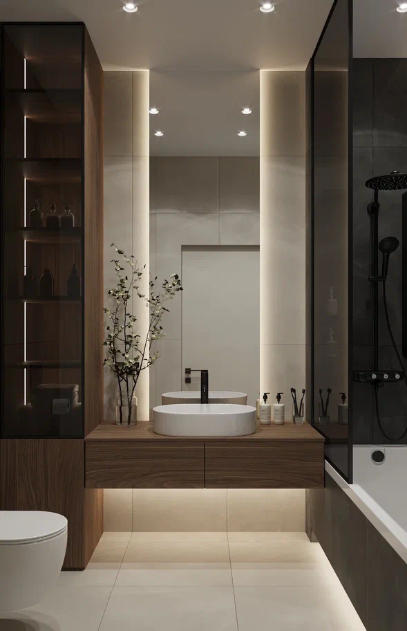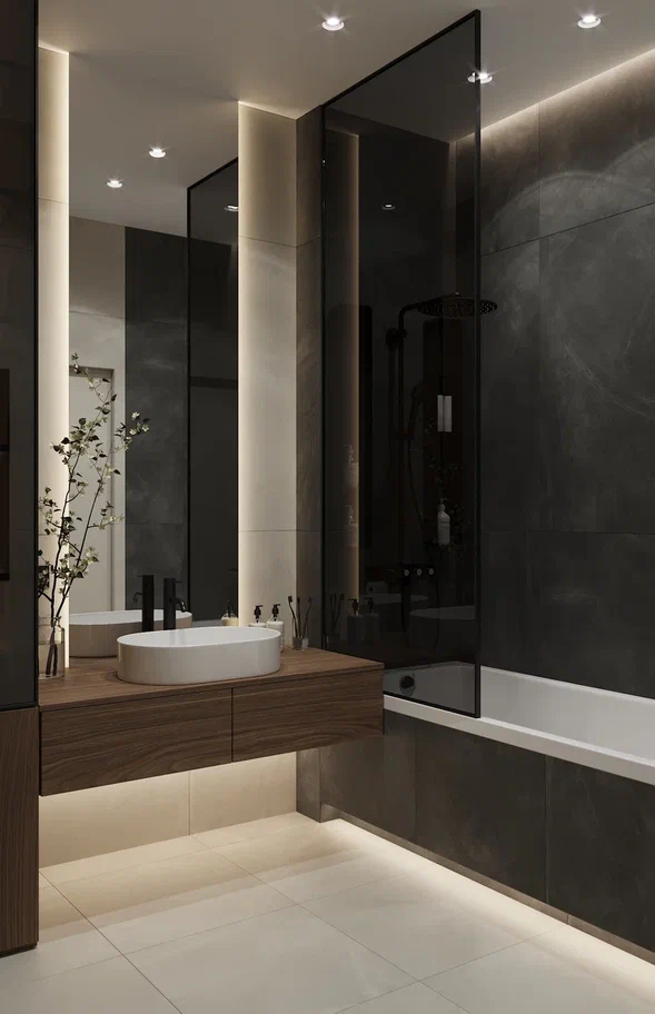 Ванная оформлена крупноформатными плитами под камень и дерево. Подвесная тумба с подсветкой и встроенное зеркало создают акцентную композицию. Душевая зона отделена стеклянной перегородкой с чёрным профилем.