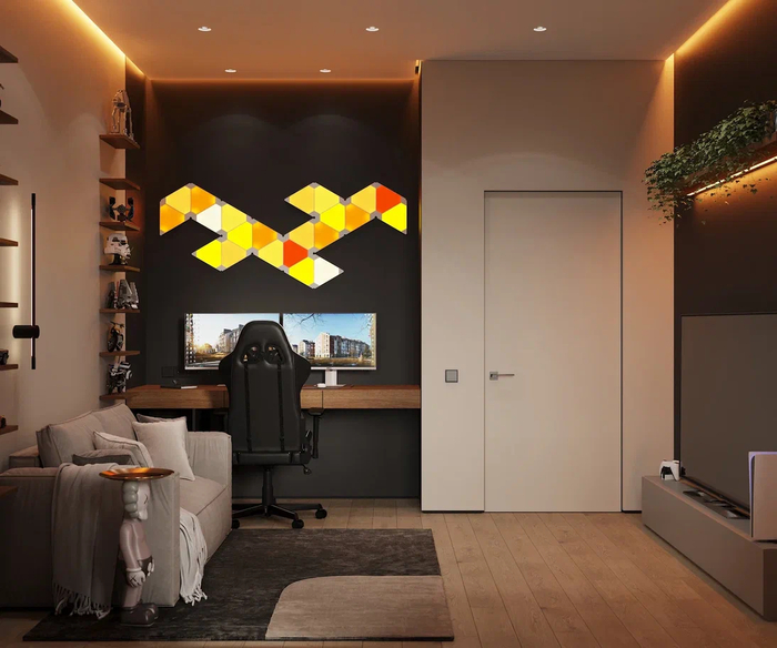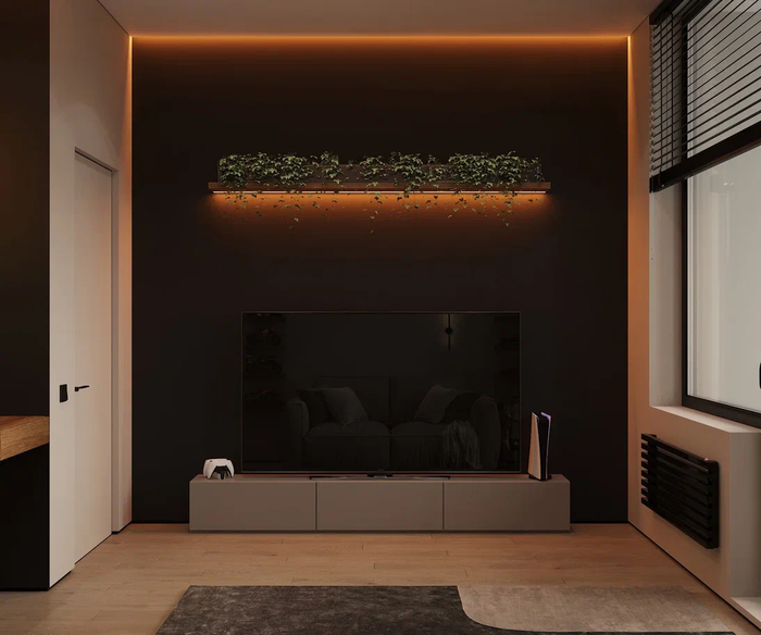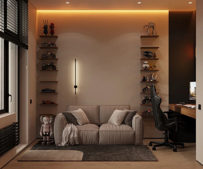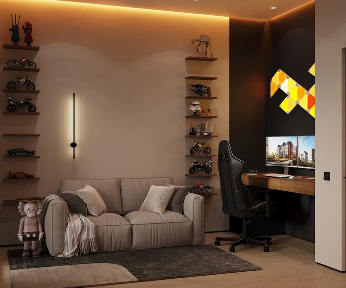 По бокам — открытые полки для коллекции фигурок и моделей, на противоположной стене — телевизор и закрытая тумба под технику. Подсветка по периметру потолка подчёркивает геометрию комнаты и визуально увеличивает пространство.
