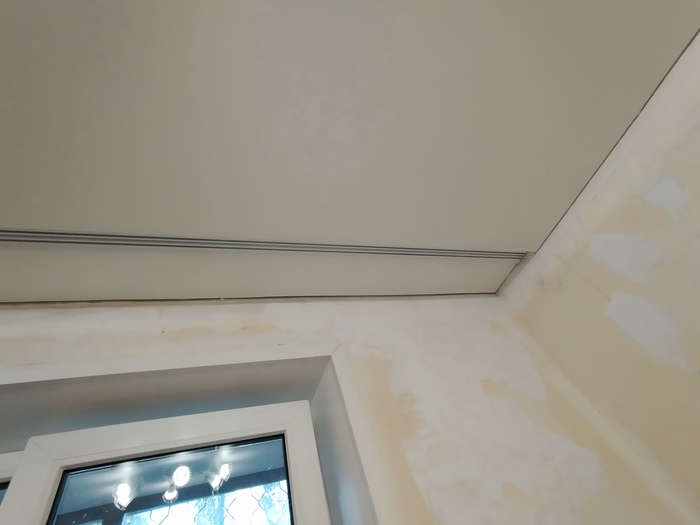 Потолочники не стали закрывать щель так как в неё при поклейке обоев заводится верхняя кромка рулона. Мастера сказали после того как наклейте обои, позвоните, мы приедем и поставим заглушку.